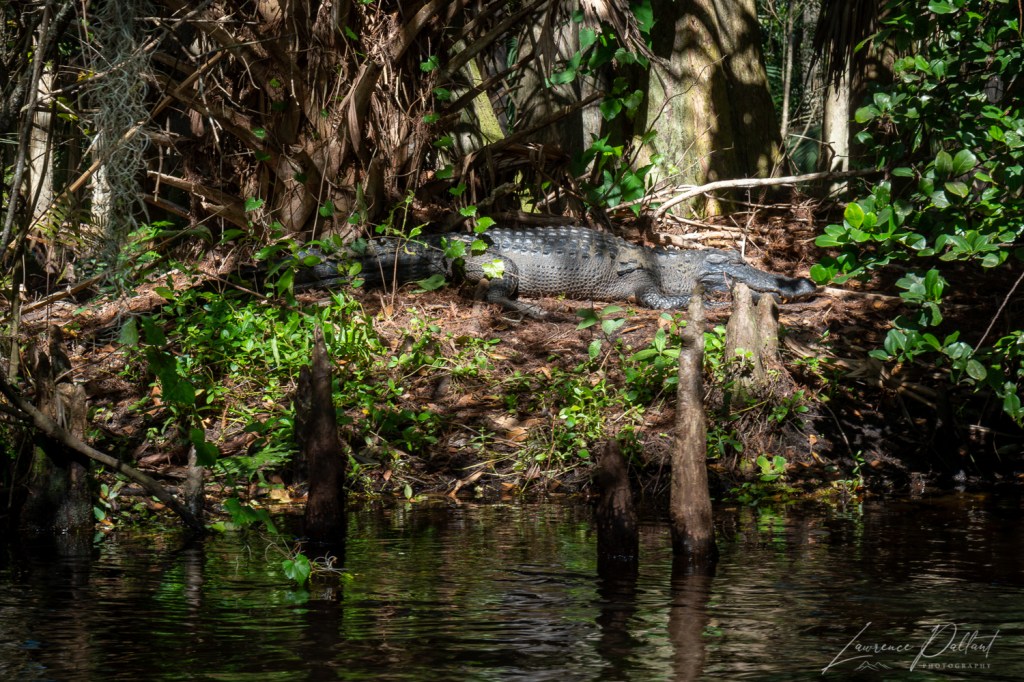 The alligator was resting on the bank in a bend in the river. The current initially pushed us toward it, which was a little scary. Once we got past it and out of the current, we paddled back for another view.
