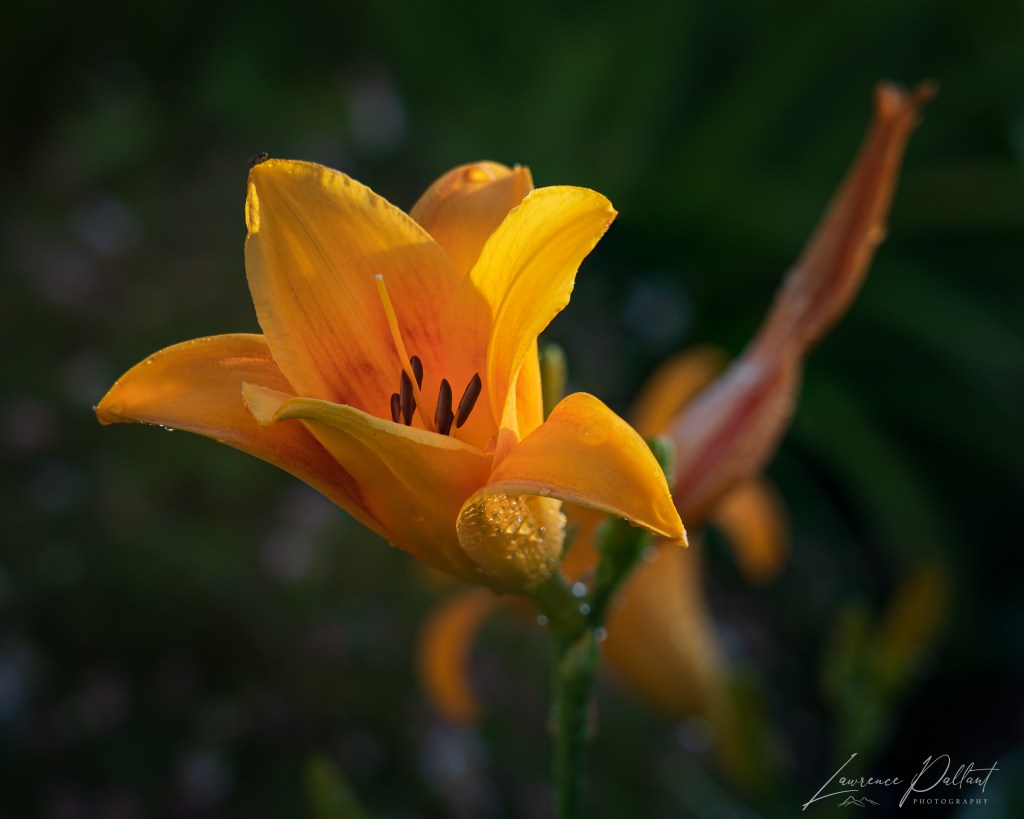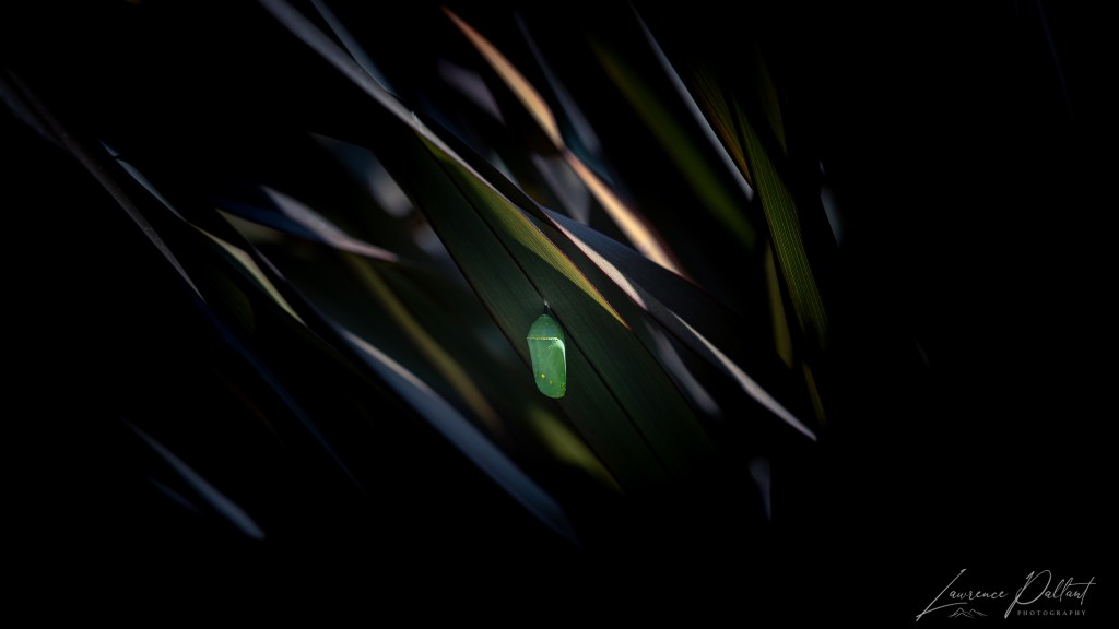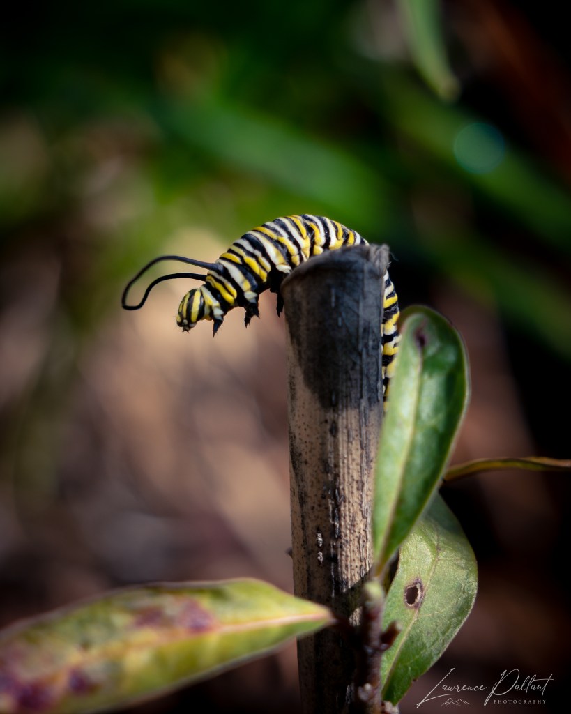 The other day while taking photos of lilies in a neighbor’s garden, the owner came out. After letting me know that she didn’t mind me in her garden, she showed me the monarch butterfly caterpillar munching on the milkweed and chrysalis hanging on some flax.