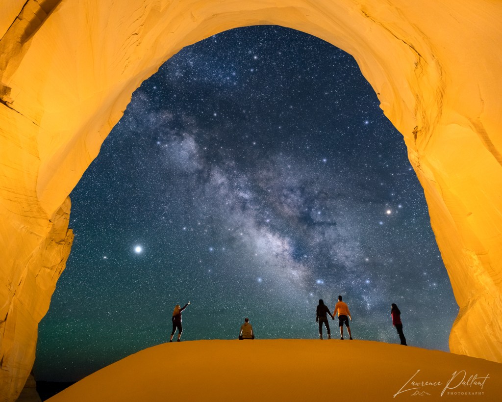 It was close to midnight. This next photo is a composite with each of us taking turns getting in the shot. I love how the Milky Way streams through the center of the alcove. It was a beautiful warm desert evening!