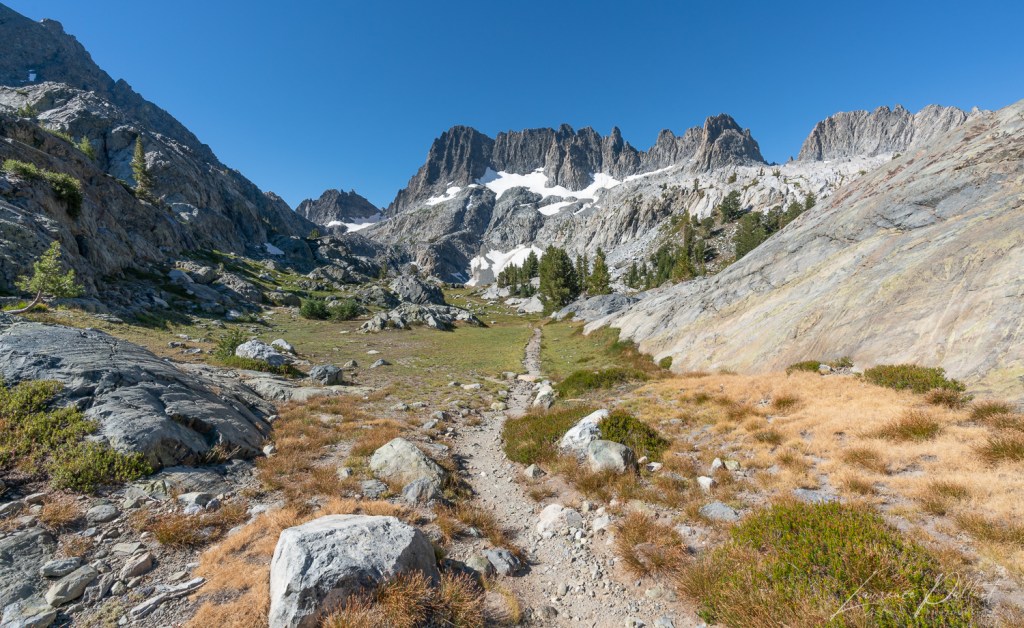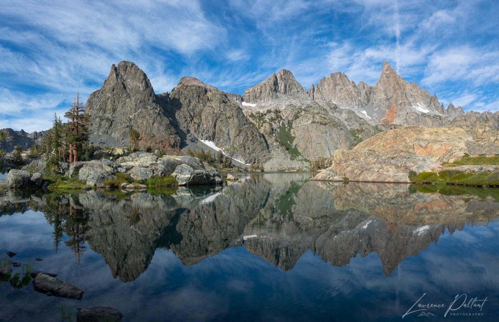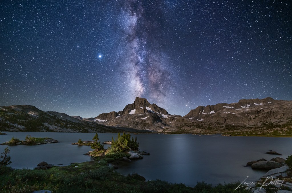 In August I returned to the Ansel Adams Wilderness for a 3-night/4-day backpacking loop, visiting several high lakes along the Sierra Crest. My favorite Milky Way shot of the previous trip was slightly blurred and I wanted to do better. I returned to the same location for the first night. For the photo below, I took a series of 12 shots for the sky at 11pm. After that, I went back to sleep until 1:30am, at which time I took another shot as the rising crescent moon cast its soft light on the landscape.