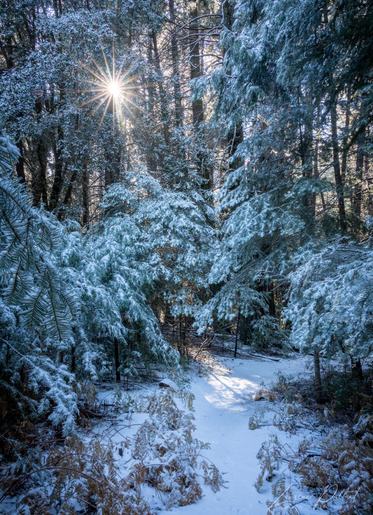 I love being the photographic explorer, going out with no idea of what I will find, and then discovering compositions. I was initially drawn to the snow laden branches of the trees in the photo above. As I stood there observing, the sun began creeping between trees creating conditions for this sun star.