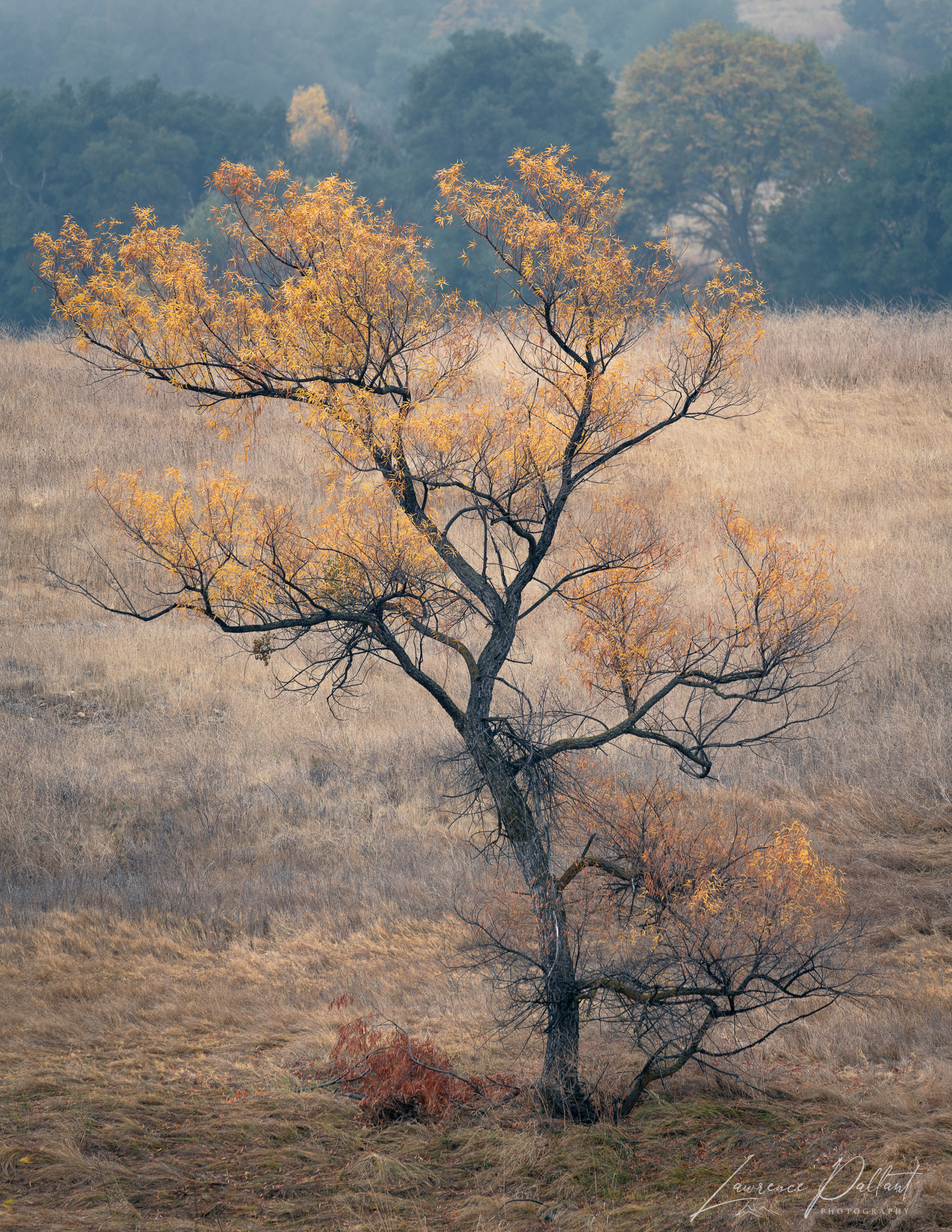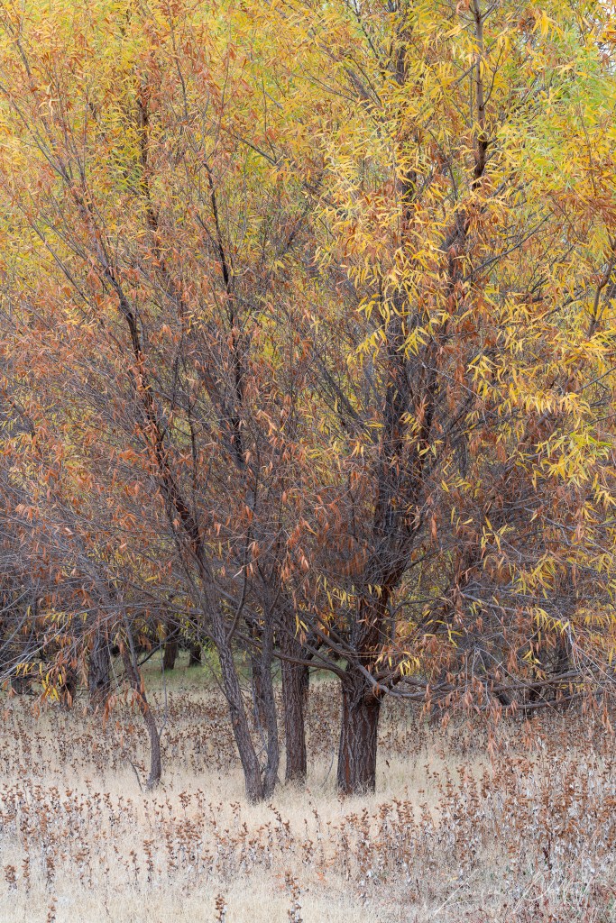 Willow trees are scattered in the meadows, along the shore, and in the water at the edge of Lake Henshaw. While some are symmetrical, others are twisted. I was fortunate to capture some of them with fall color at the end of November.