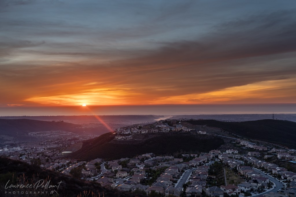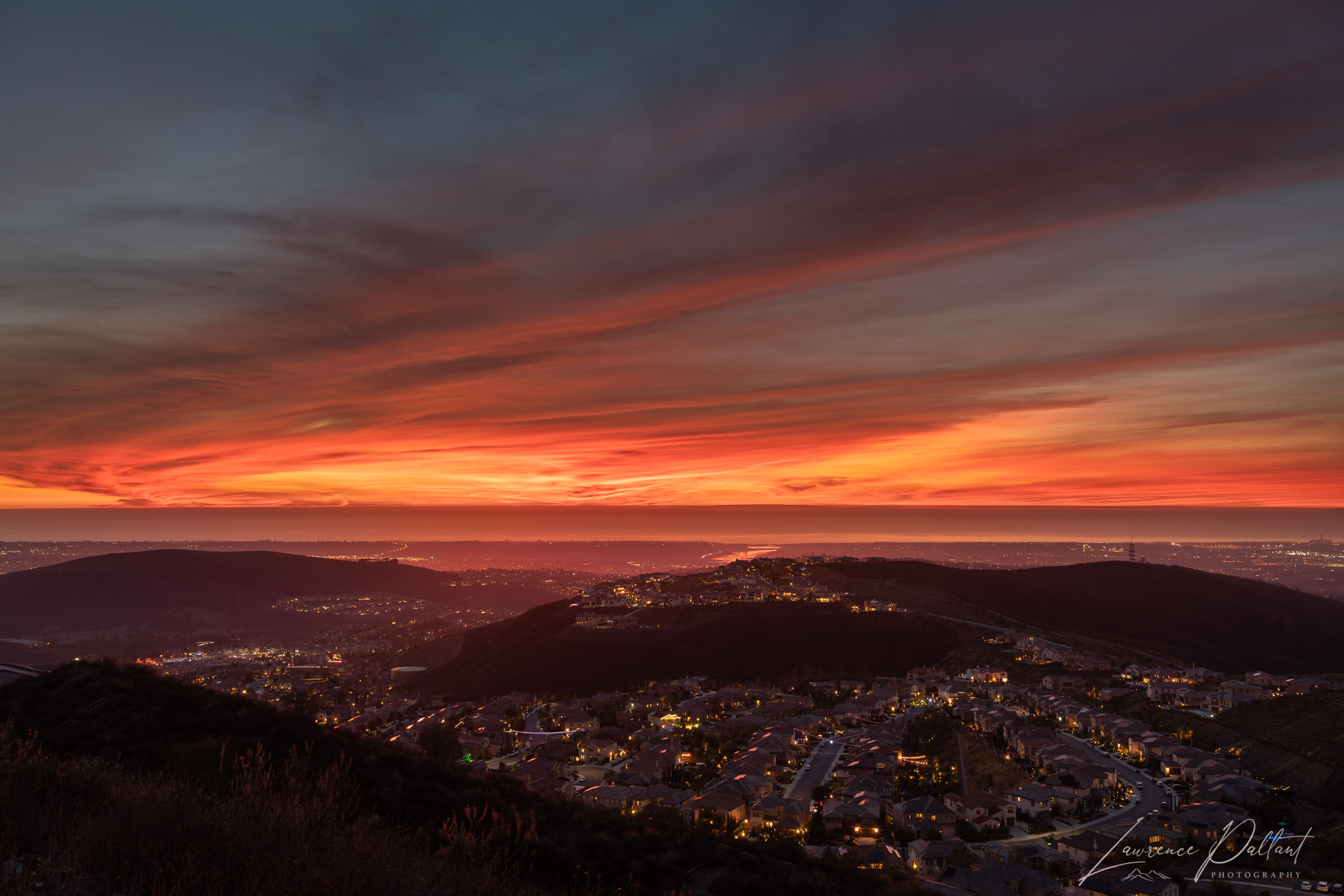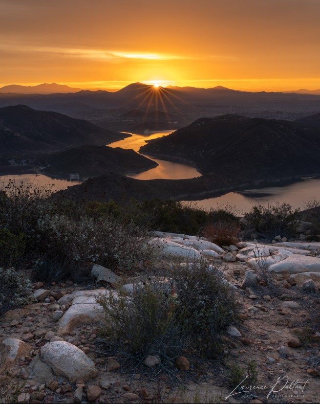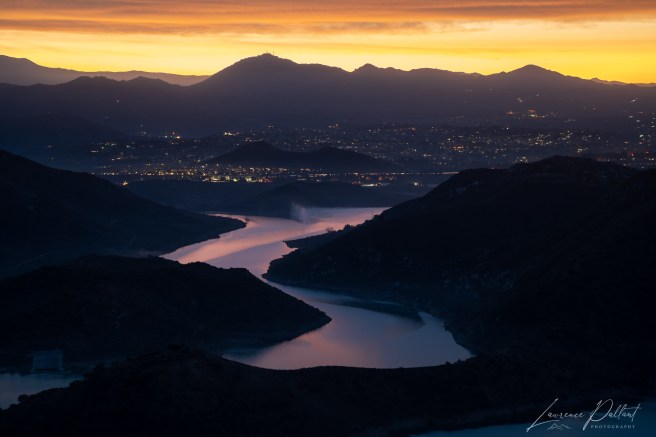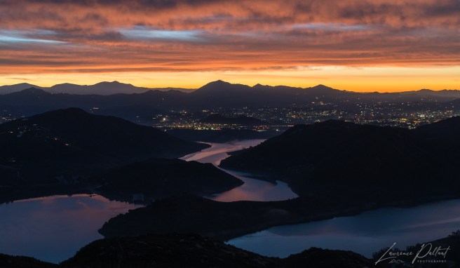 About a week ago, I made two trips to a local hilltop viewpoint, overlooking Lake Hodges, Rancho Bernardo, Poway, and Mount Woodson. I spent about an hour there each time, watching the predawn glow of blue hour turn to gold and finally for the sun to rise. Both days provided a layer of high clouds that caught the glow and reflected in the lake and landscape. On my first trip, I was with another photographer friend, Alexander Kunz, who also got some great photos and posted here: Del Dios Highlands Dawn.