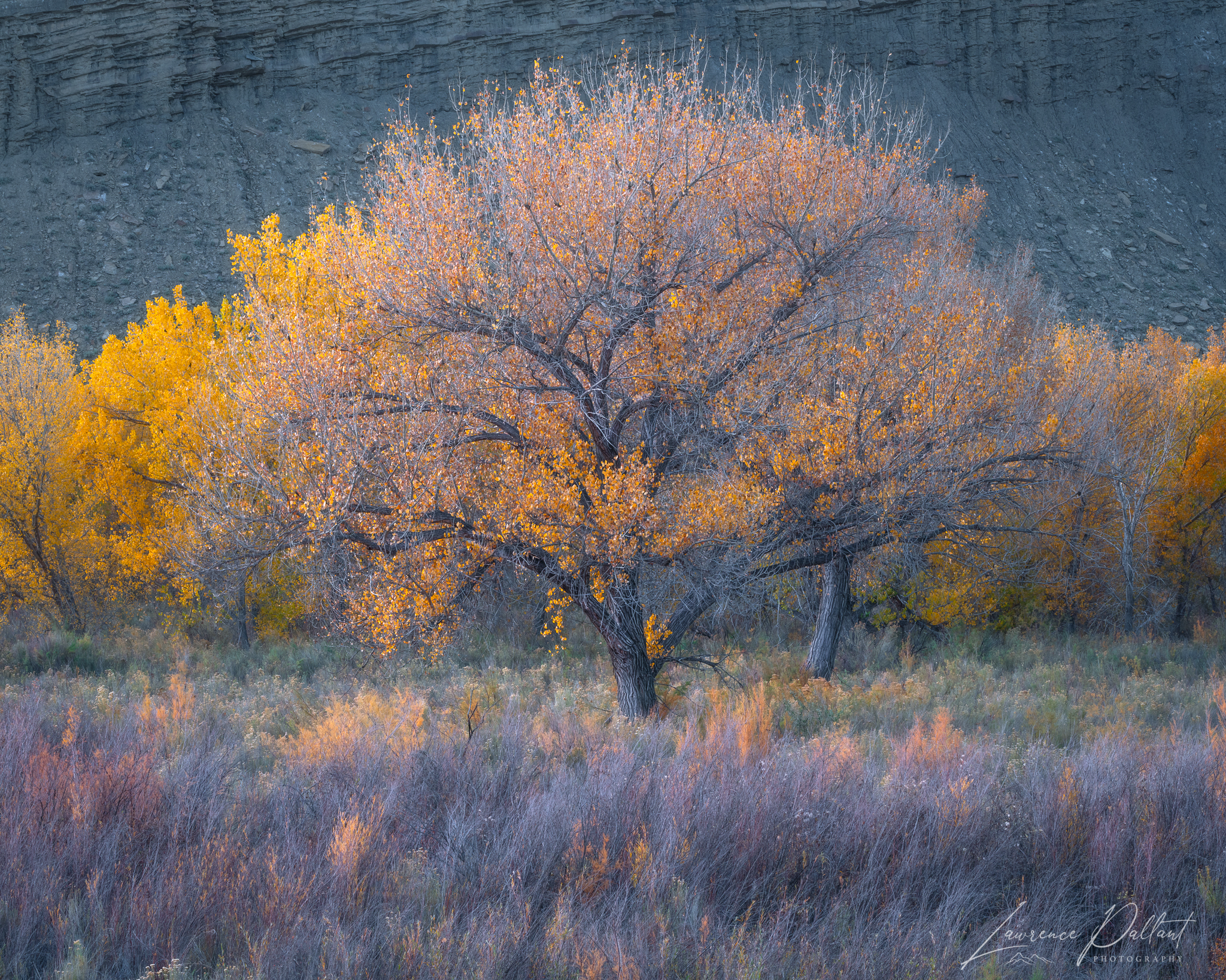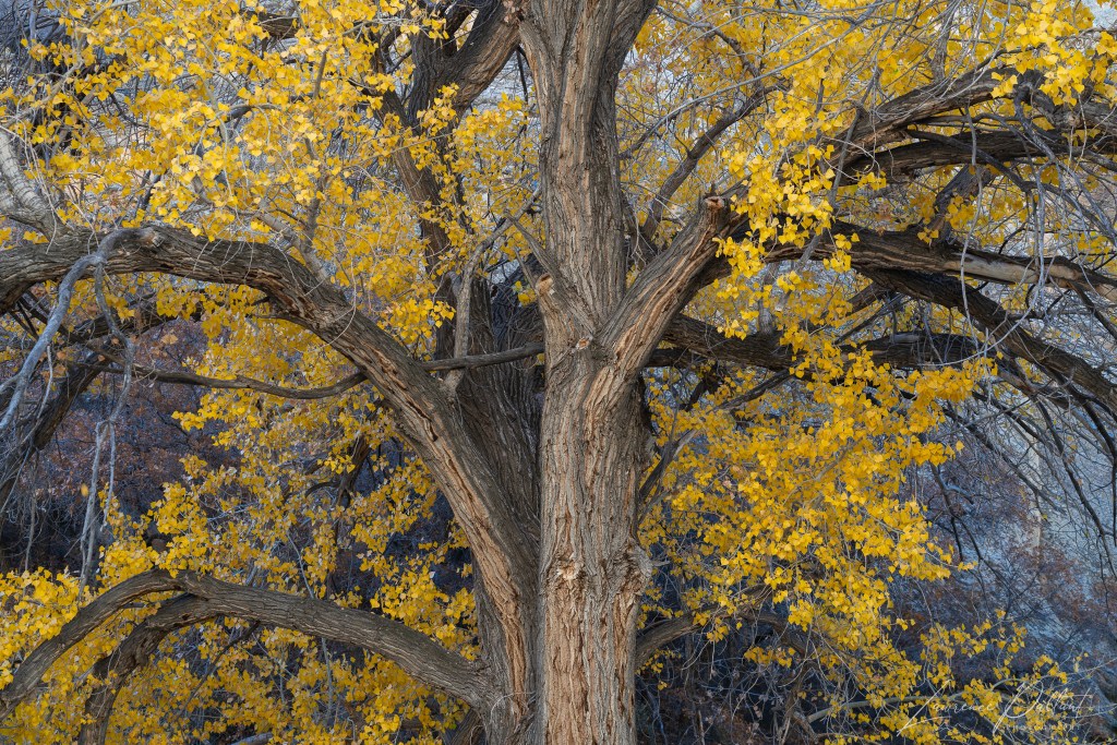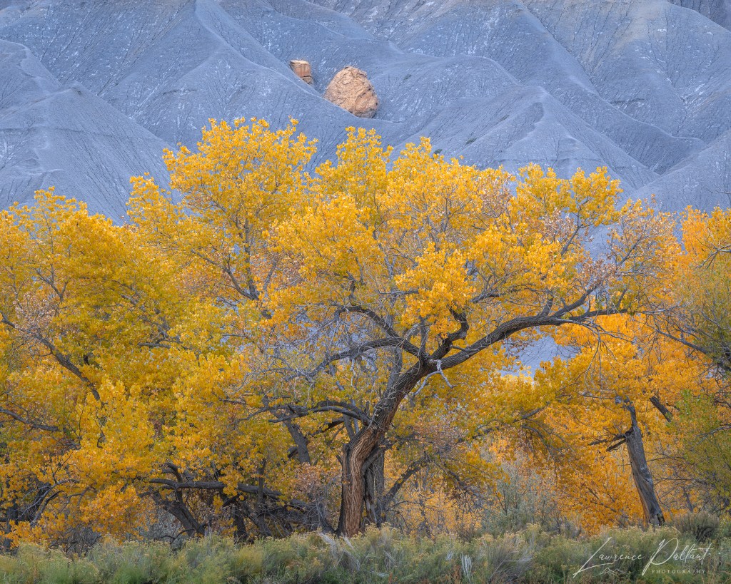 iI based myself near Capitol Reef National Park in Utah for about a week at the end of October, exploring the park and areas around it for fall color. Cottonwoods are the most common tree and tends to grow along river plains. There was often a stark contrast between the lush river plain and the badlands or cliffs directly beyond.