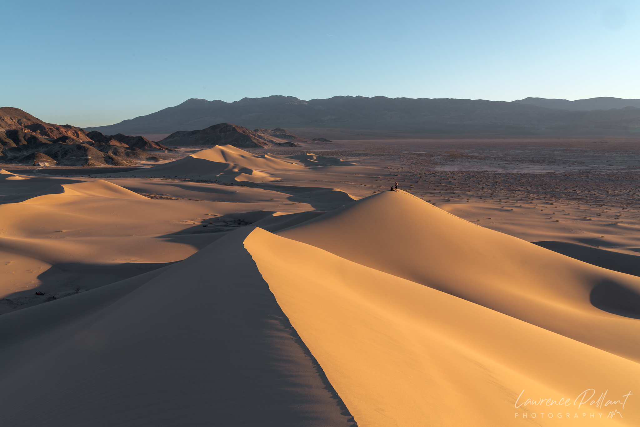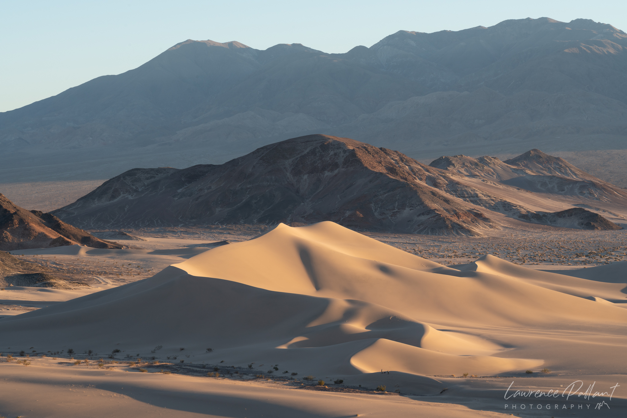 I made another short trip to Death Valley National Park in late January. On my first day, I headed into the dunes late in the day to capture the shadows and glow on the dunes. As I hiked in, I observed a couple climbing the tallest of the dunes, extending some already existing tracks to the top. As I wandered the dunes, they left and I observed another two people approaching the dunes. Eventually I wandering into the vicinity of these two guys, who were setting up a tent.