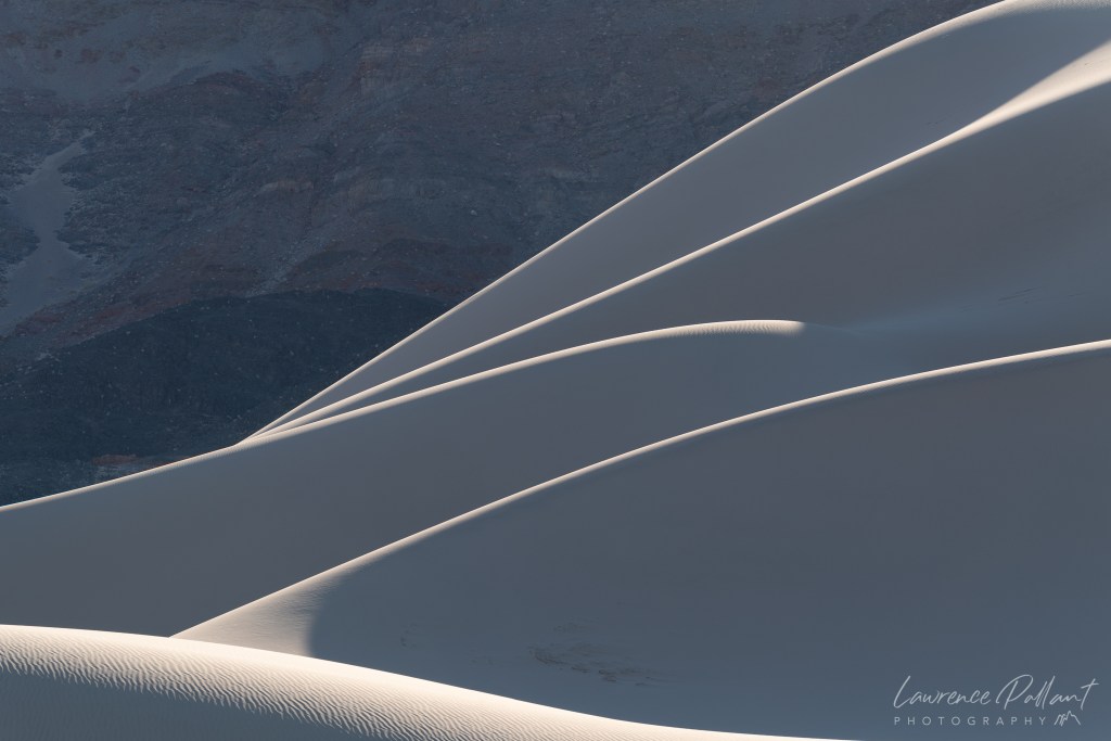 I read an article by an outstanding photographer, Michael Bollino, in which he defines “found” photographs, where you have no concept ahead of time of what you will photograph. In my first “Top of the Dunes” photo I had pre-conceived ideas from a previous trip. I knew the set of dunes I wanted as my subject and I knew they catch the last rays of the sun. In addition, I had seen photos of others with a viewpoint from below. I checked out the scene, but seeing footprints, I choose to climb the dune. At this point I started exploring compositions. In the “Confluence” and “Convergence” photos, the compositions were a result of being there, being open, and finding something totally unexpectedly. When I set off that morning, my expectations were so low, I almost didn’t go. These turned out to be my favorites of this trip. Pre-conceived ideas often bring me to a location, but once there, I like to allow myself to explore and see with every step. It’s a balancing act.
