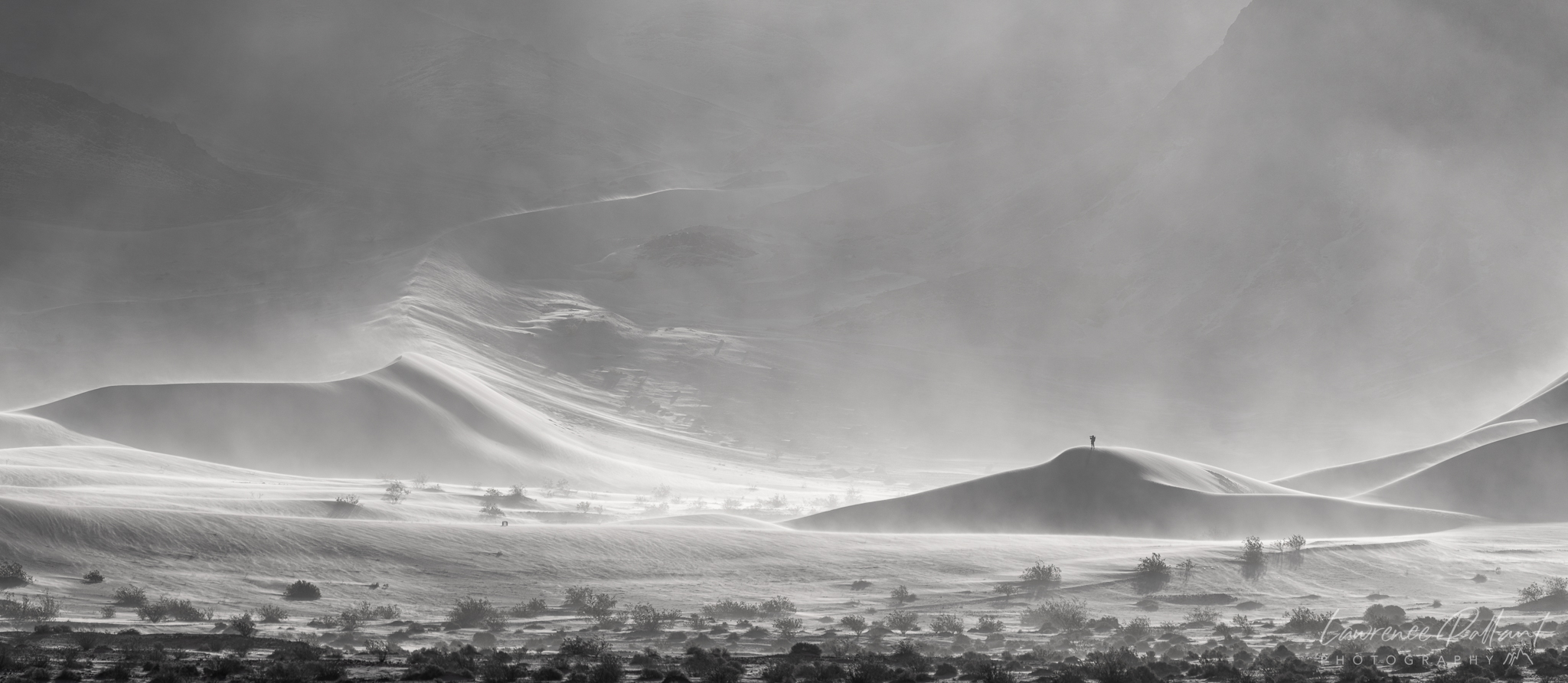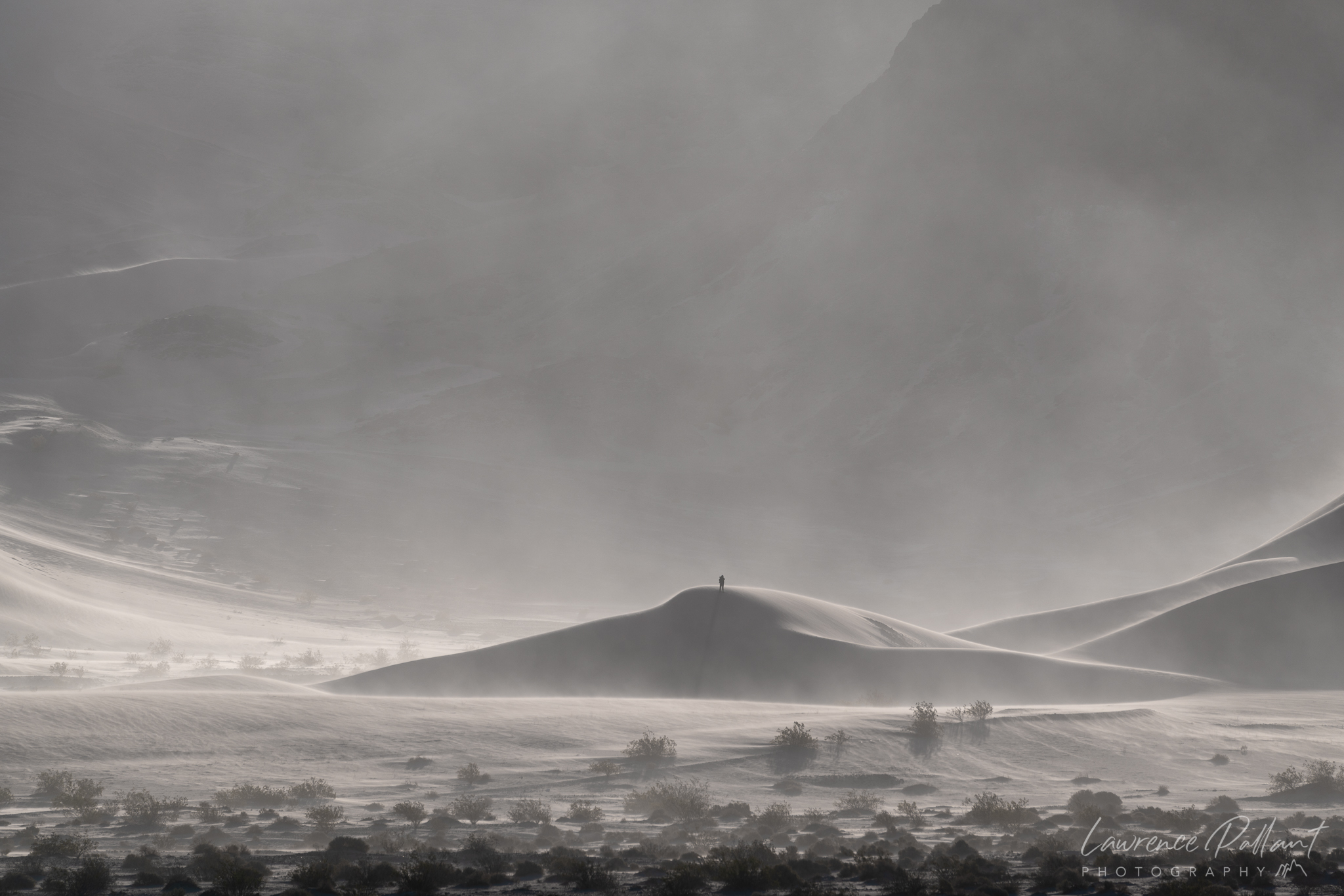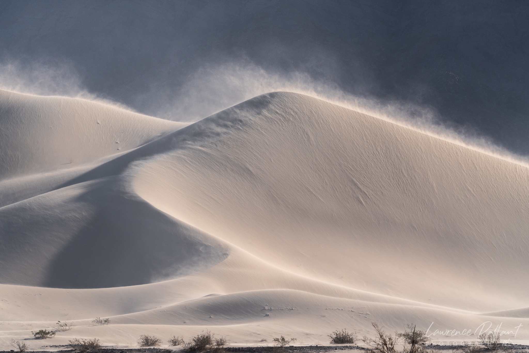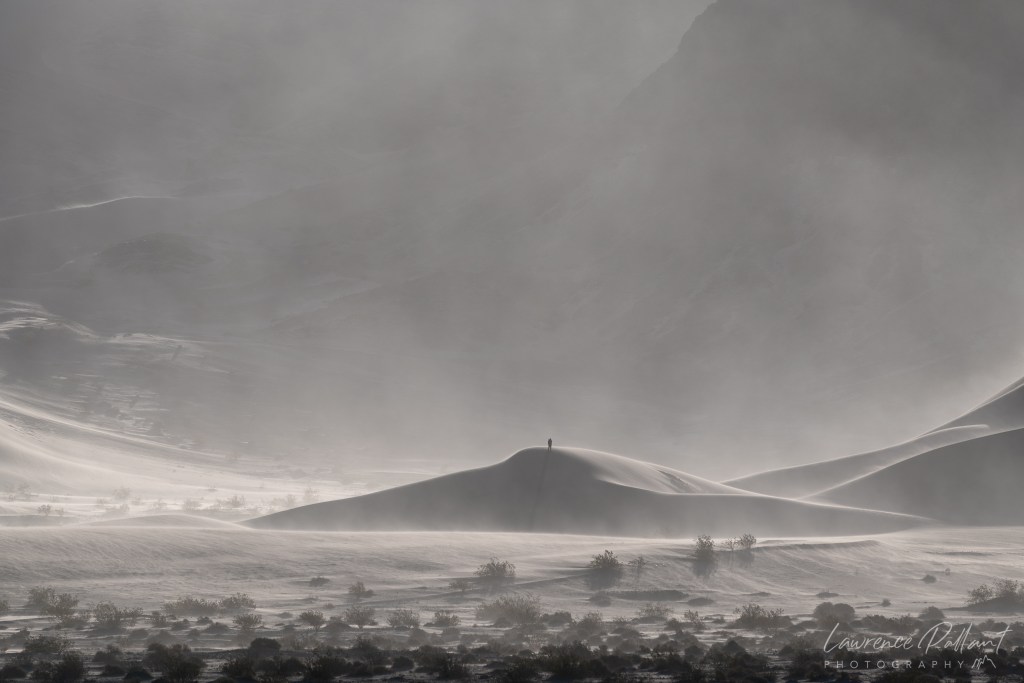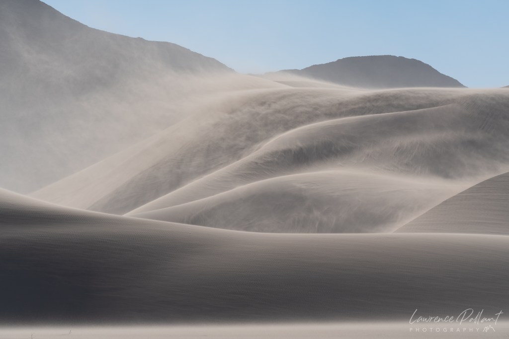 I returned to Death Valley National Park in early March and was fortunate to be there in a high wind event. It was amazing and exhilarating to be on the sand dunes. In many places the sand was blowing up the side of the dune like an upward flowing river and over the crest like a waterfall.