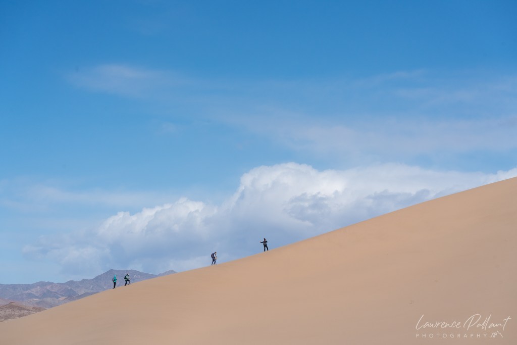 The photo below is a panoramic stitch of 3 photos. I had not planned on creating a panorama while in the field. But there were two distinct areas of focus; the photographer on the dune and the tremendous “tidal wave of sand” to his left. I realized at home I had the pieces and let Lightroom do it’s magic to put it together.