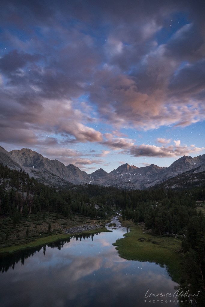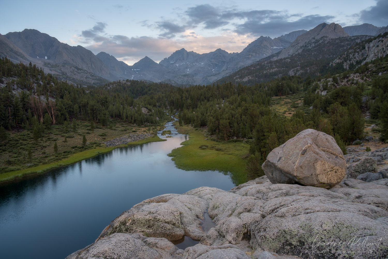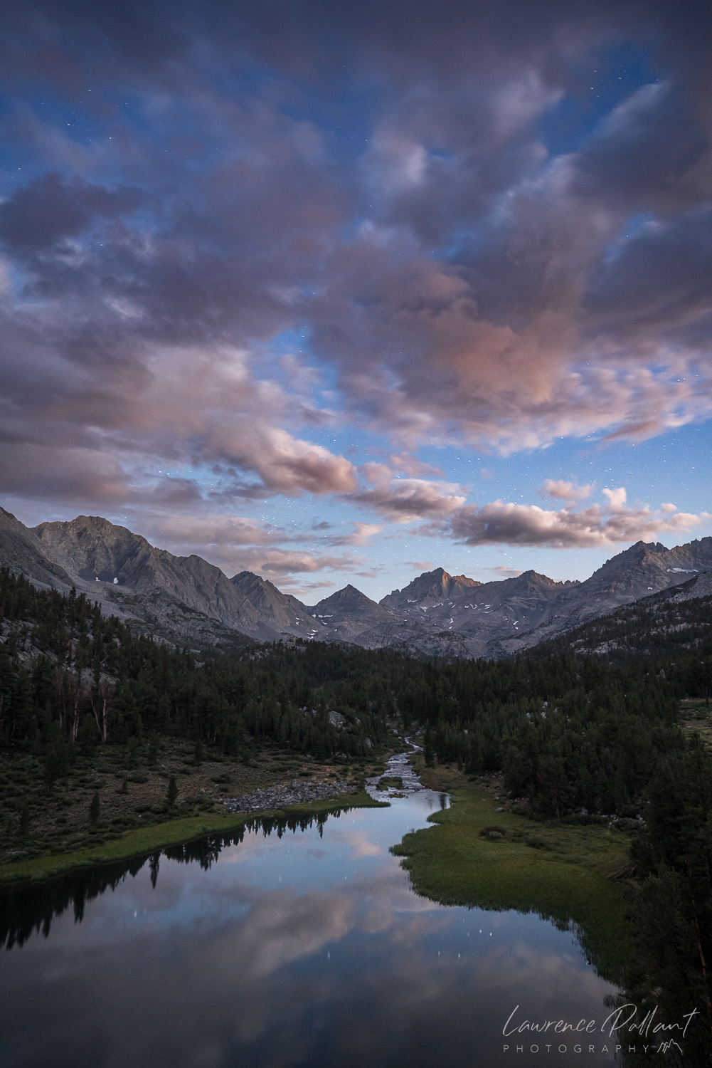 Little Lakes Valley is one the places in the eastern Sierra Mountains that draws me back again and again. I have backpacked through it, camped at its lakes in both summer and winter, and climbed one of its peaks. On this day I arrived in camp at about 4 PM during a typical afternoon thunderstorm. At around 6 PM, most of the rain had stopped and I hiked into the valley. I arrived on the rocky knoll below around 7 PM.