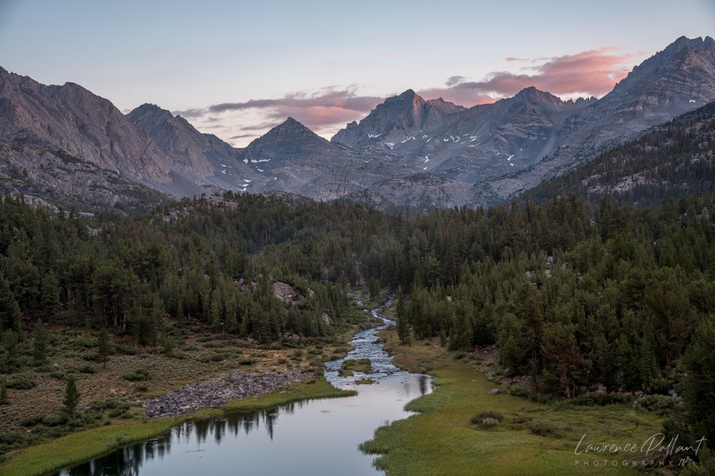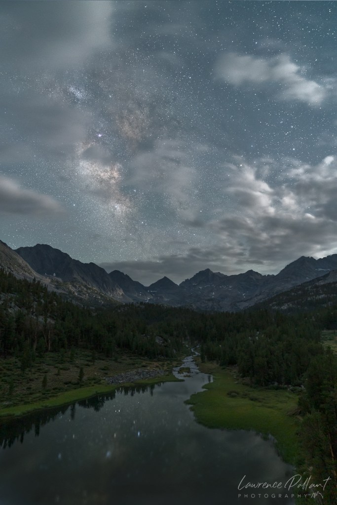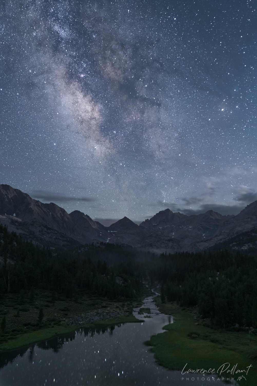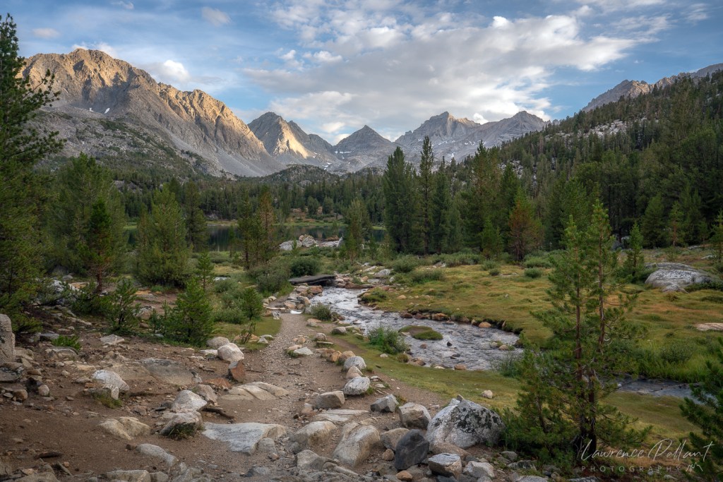 Little Lakes Valley is one the places in the eastern Sierra Mountains that draws me back again and again. I have backpacked through it, camped at its lakes in both summer and winter, and climbed one of its peaks. On this day I arrived in camp at about 4 PM during a typical afternoon thunderstorm. At around 6 PM, most of the rain had stopped and I hiked into the valley. I arrived on the rocky knoll below around 7 PM.