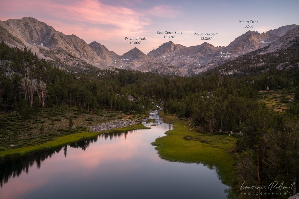 In June of 1997, I climbed Mount Dade with my good friend Gary. We probably camped the night before at the Treasure Lakes. It was a snow climb up the Hourglass Couloir, which I read here gets up to a 40° angle. In the picture below, the Hourglass Couloir has no snow. Click on the photo below to enlarge and see the names and elevations of the peaks. I climbed Mount Dade again in June 2011, but only as far as the top of the couloir.