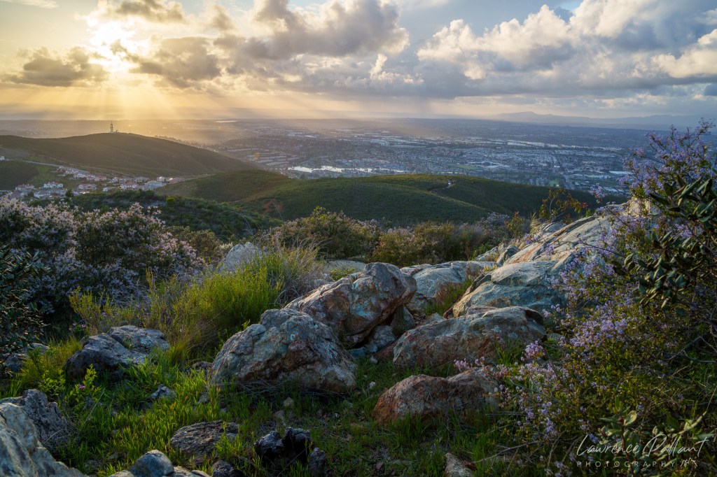 I was inspired to try to find other compositions. A week later, on my way back from Volcan Mountain, with storm clouds on the horizon I explored an area near the peak. Unfortunately, the ceanothus was past its peak and the wind was howling. I decided to focus on a rocky area as a foreground since rocks were stable in the wind.