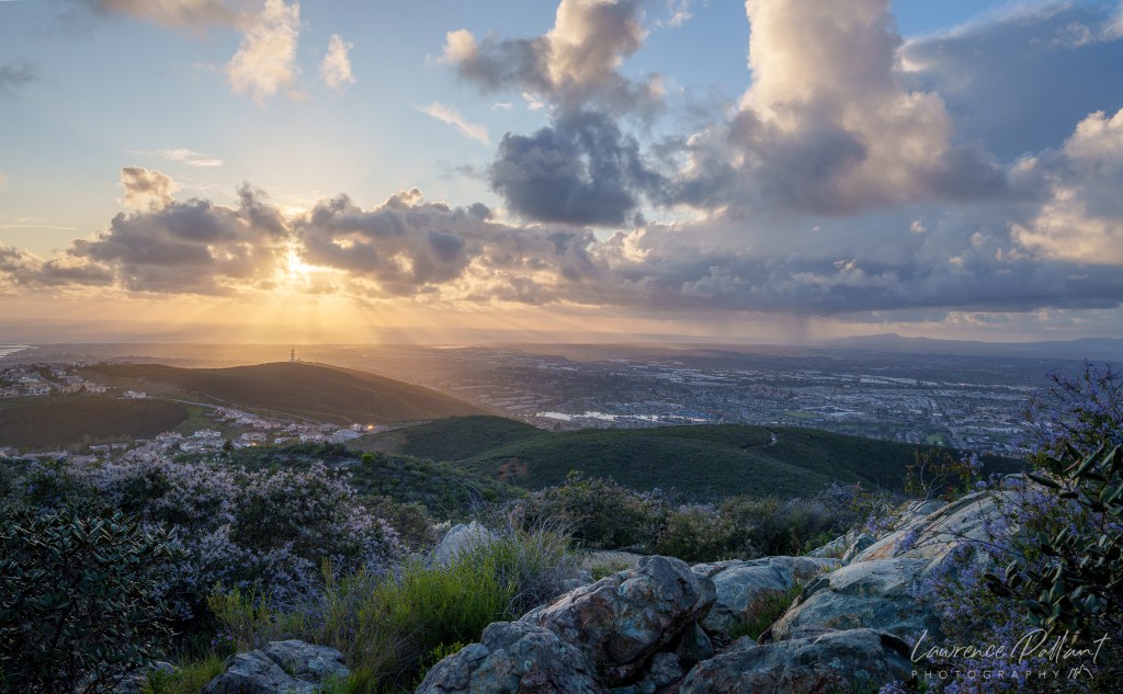 There is a lot going on here. Along with the sun casting beams through the clouds and the blue ceanothus, there is rain falling from one of the storm clouds.