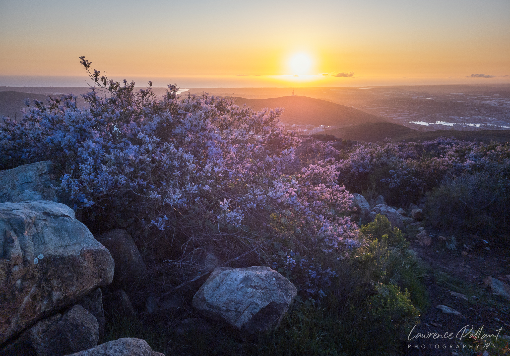 I usually to hike to the top of Double Peak once a week as a workout. The view is stunning, but finding photographic compositions can be difficult due to the urban setting and a nearby water tower. While hiking recently with friends, one of them found a composition that hid the water tower behind a blooming ceanothus. I got inspired! When hiking a week later, I captured a similar shot with my cell phone. Click here to see this full collection.