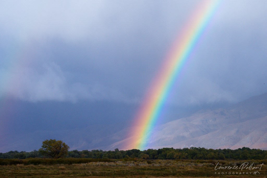 A month ago, I drove up to the eastern Sierra to capture fall colors. I drove through a storm for most of the day after leaving San Diego. By the time I reached the Owens Valley, the system had moved east toward the White Mountains, leaving clear skies to the west. The conditions were ideal for a rainbow—late in the day, sun low in the sky, and rain falling in the east. Soon, a brilliant rainbow appeared. Although there was no strong foreground element for my photo, I found a safe spot to pull over and captured the moment.