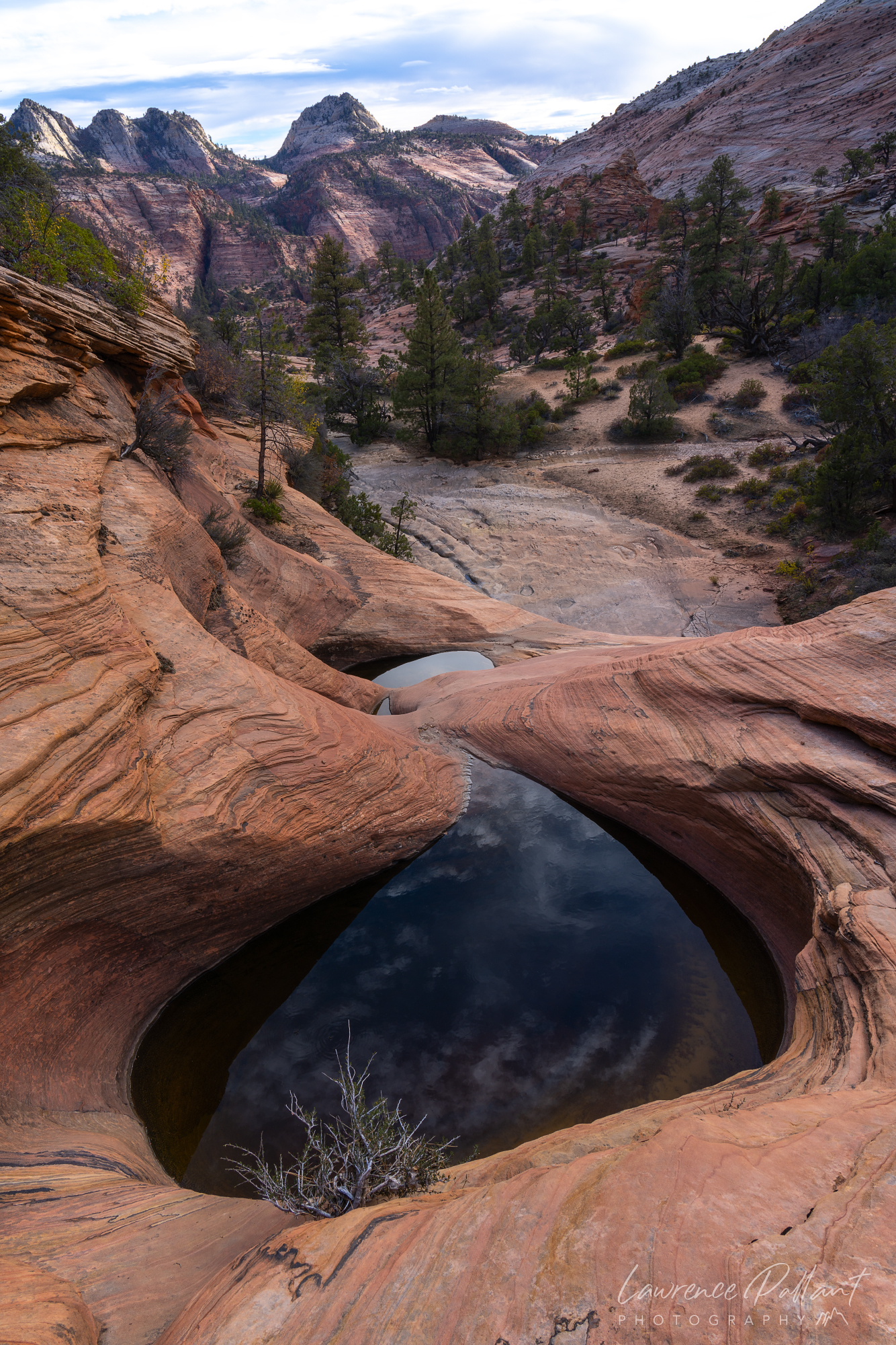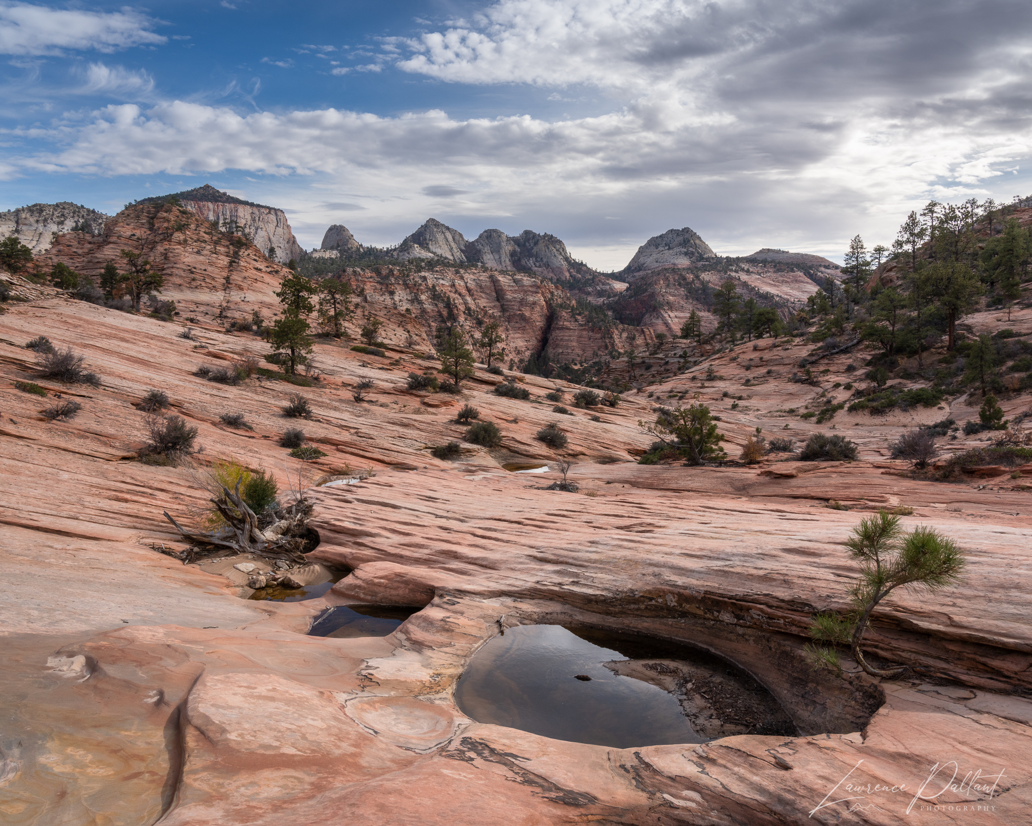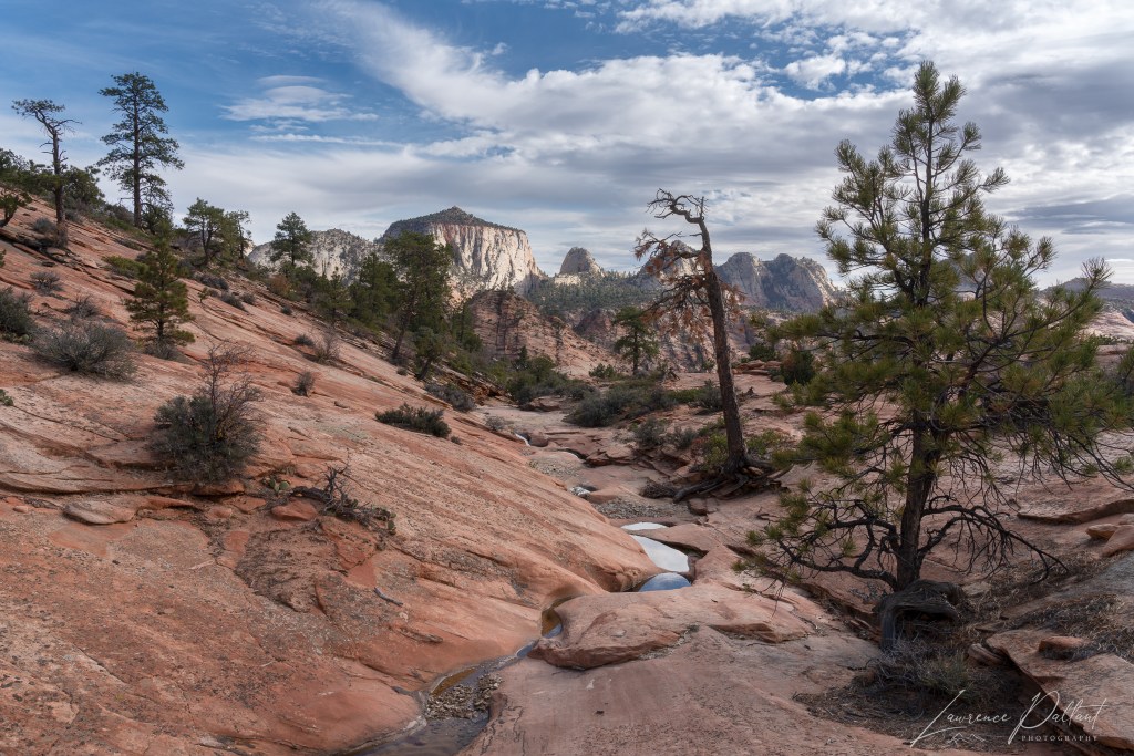 After sunrise at Observation Point, we headed to the canyons on the eastern side of the park. I didn’t carry much camera gear to allow me to travel lighter. I had one lens and a tripod. To my surprise we stumbled into a wonderful area with a string of small pools of water in the rock. I didn’t realize it until I got home and looked at the photos that the pool below is shaped lake a teardrop.