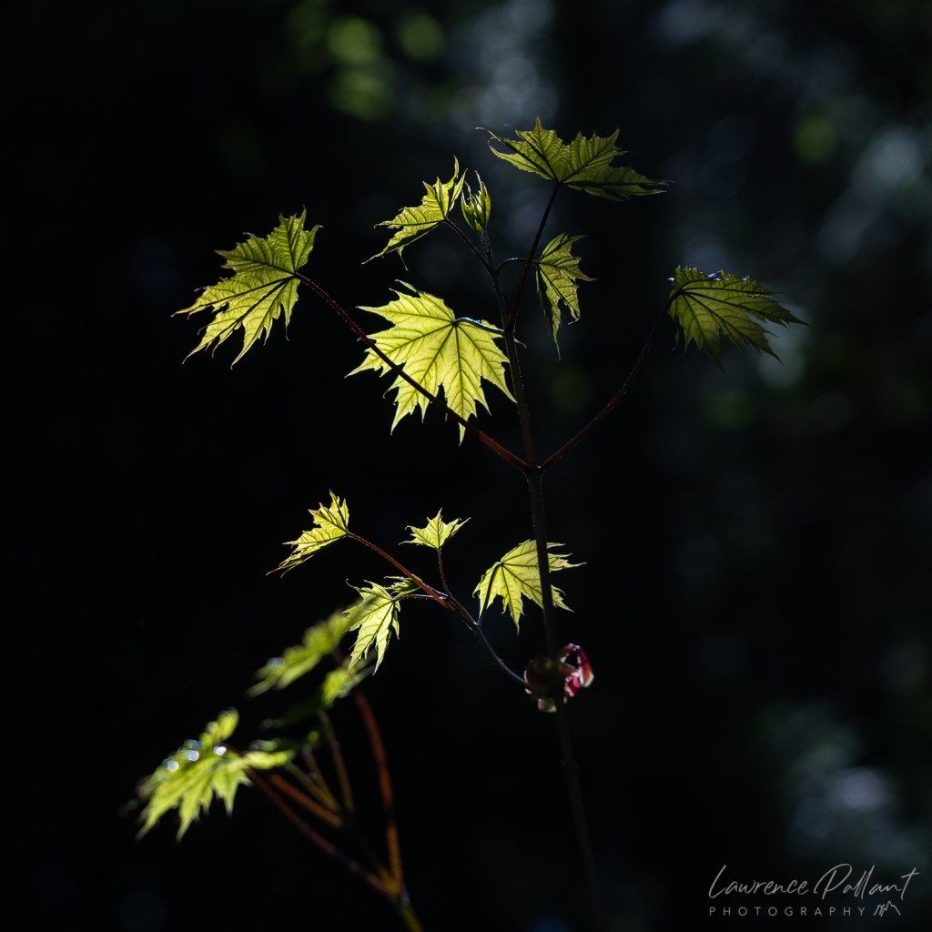 The maple leaves below were backlit by the sun which makes them appear to glow. It was probably a little windy so I used a fast shutter speed.